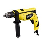 Taladro percutor con velocidad variable. Potencia 750 Watts. Velocidad 0-3100 rpm. Mandril de 13 mm con avance y retroceso. 2 modos (Rotación y percusión). Selector de velocidad. Interruptor con bloqueo para uso continuo. Guia plastica de profundidad. Peso neto 1,85Kg. Incluye 3 mechas para metal , 3 para pared, 3 de madera y 6 puntas atornilladoras de Acero Rapido(HSS). Caja madre 5 unidades”